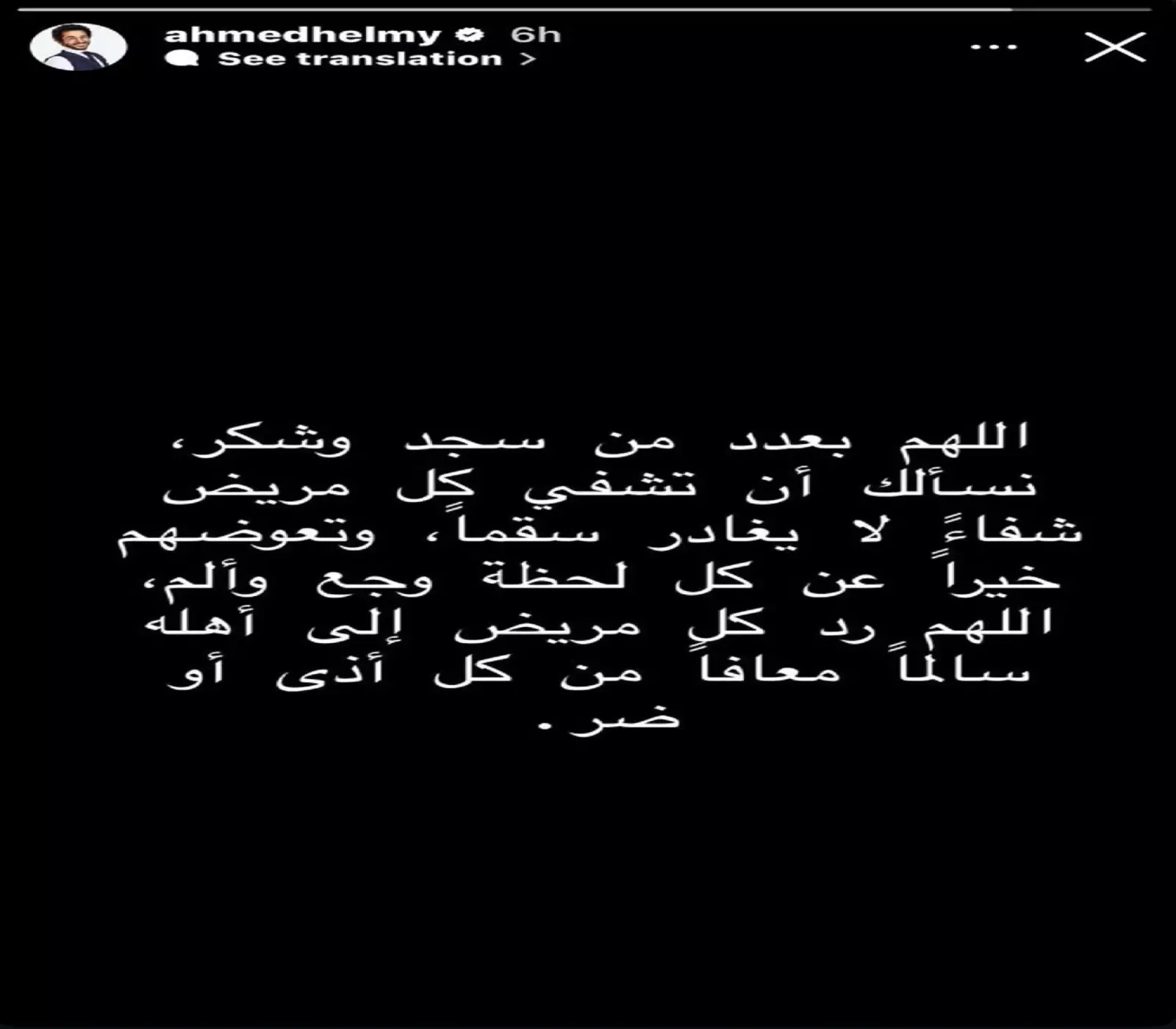 أحدث الفنان أحمد حلمي حالة من الحزن والقلق بين جمهوره بعد نشره رسالة غامضة عبر خاصية "القصص المصوّرة" على حسابه في "إنستغرام"، طلب فيها الدعاء للمرضى بالشفاء العاجل. هذا المنشور المفاجئ أعاد للأذهان الأزمة الصحية التي مر بها حلمي قبل عدة سنوات إثر إصابته بورم في الظهر وخضوعه لعملية جراحية ناجحة لاستئصاله.