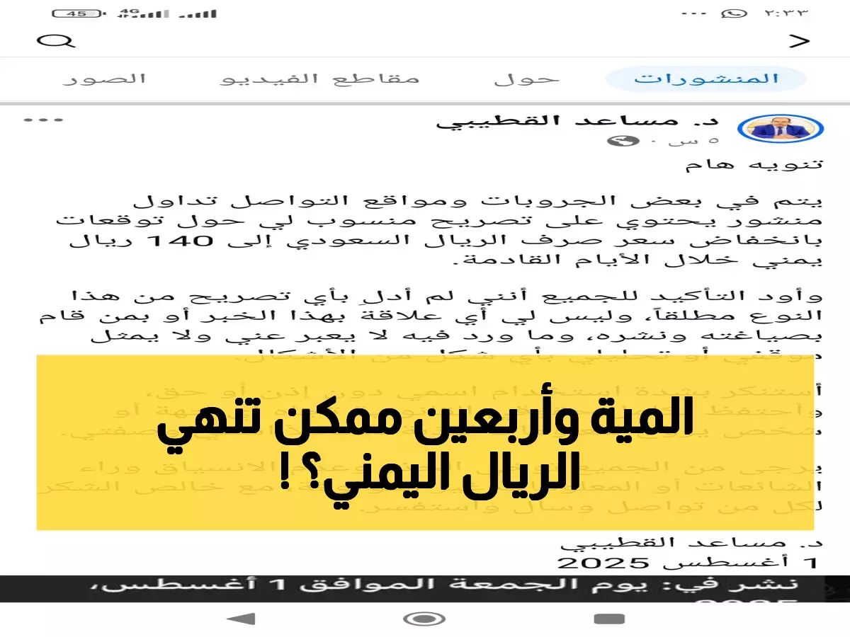 مفاجأة من خبير يمني: تنبؤ تاريخي يضع العملة اليمنية على مفترق طرق! | الرقم 140 يكشف تحليلاً صادماً قدمه الدكتور القطيب