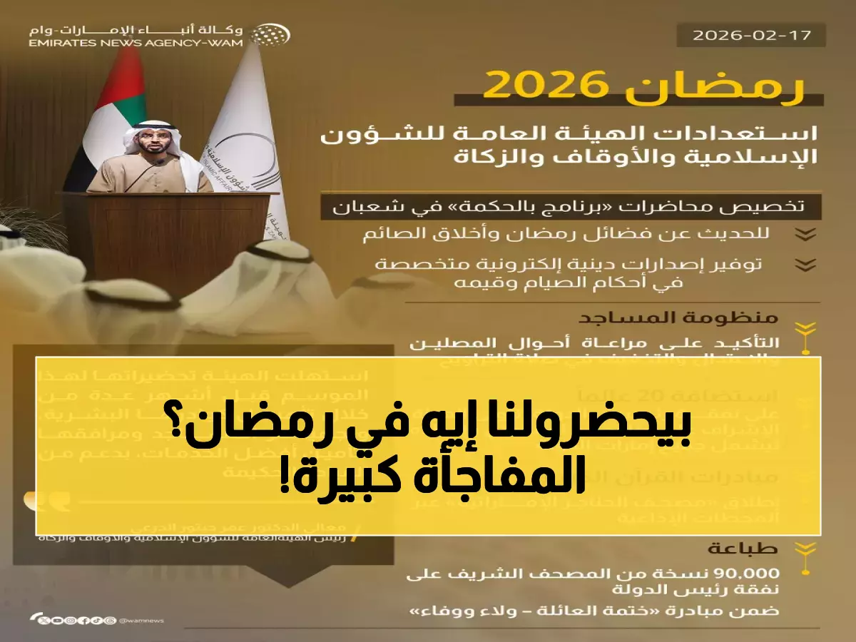 476 مليون درهم في عام واحد - رقم قياسي حققته هيئة الشؤون الإسلامية الإماراتية، فيما تكشف عن خطة رمضانية استثنائية تضم 6000 ختمة قرآنية تُهدى لحكام الإمارات المؤسسين ومشاركة 20 عالماً من 12 دولة على نفقة رئيس الدولة.