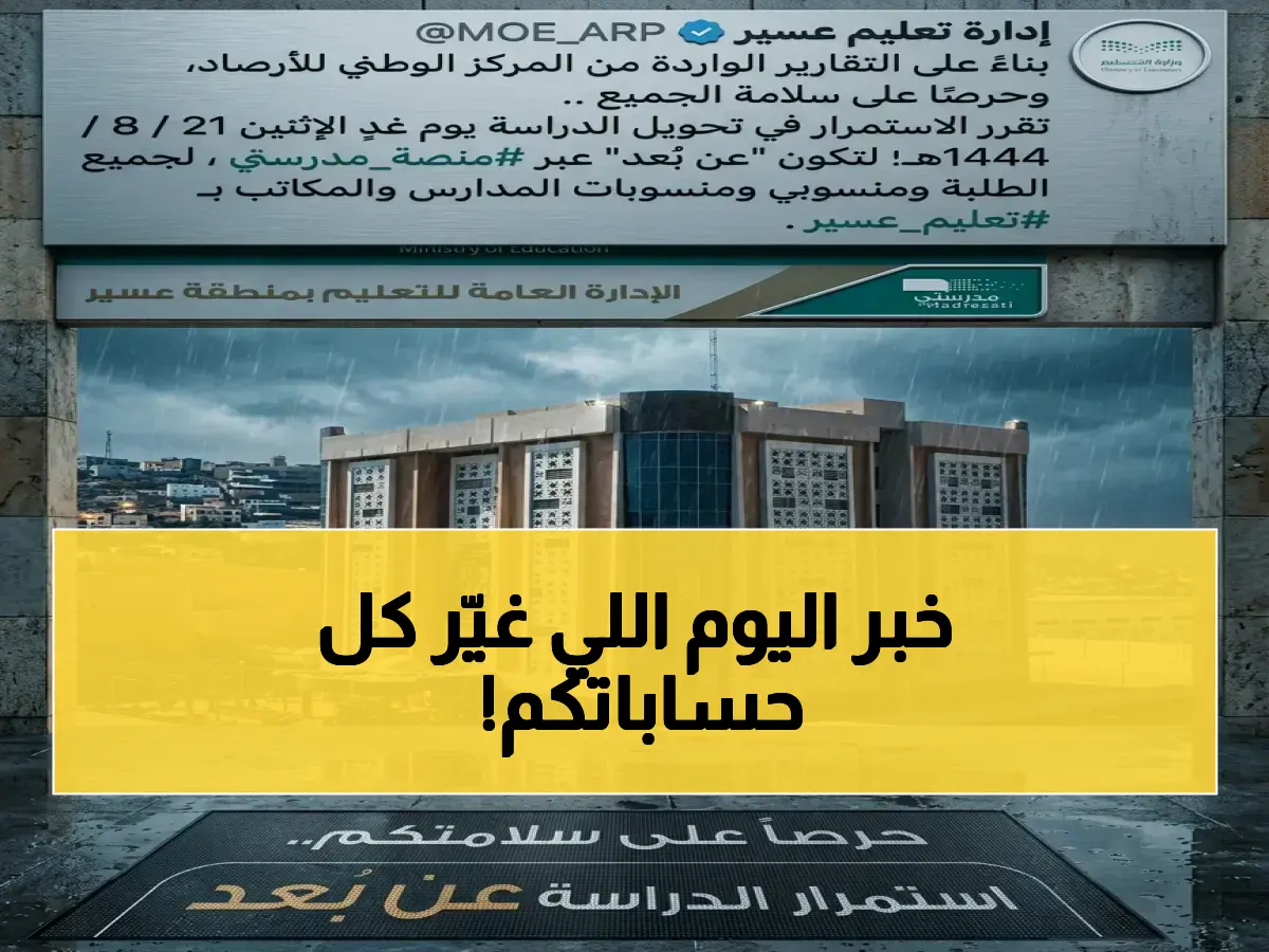 تحذيرات الطقس هي التي دفعت الإدارة العامة للتعليم في منطقة عسير لتغيير خطة اليوم الاثنين بشكل جذري، حيث تقرر تحويل الدراسة إلى نظام عن بُعد لجميع مدارس المنطقة.