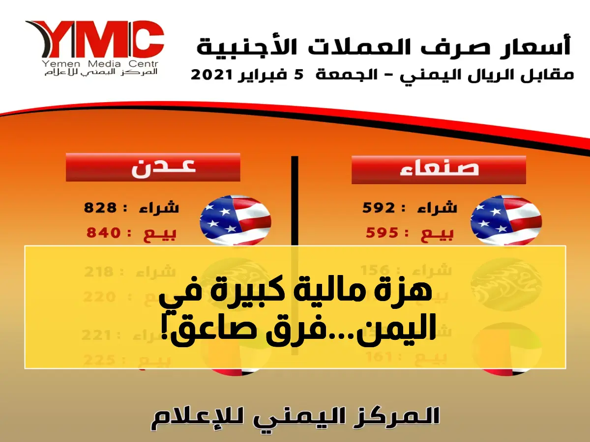 وكشفت أسعار الصرف الرسمية عن هوة شاسعة بين المناطق الخاضعة لسلطة الحكومة المعترف بها دولياً في عدن، وتلك الواقعة تحت سيطرة جماعة الحوثي في العاصمة صنعاء.