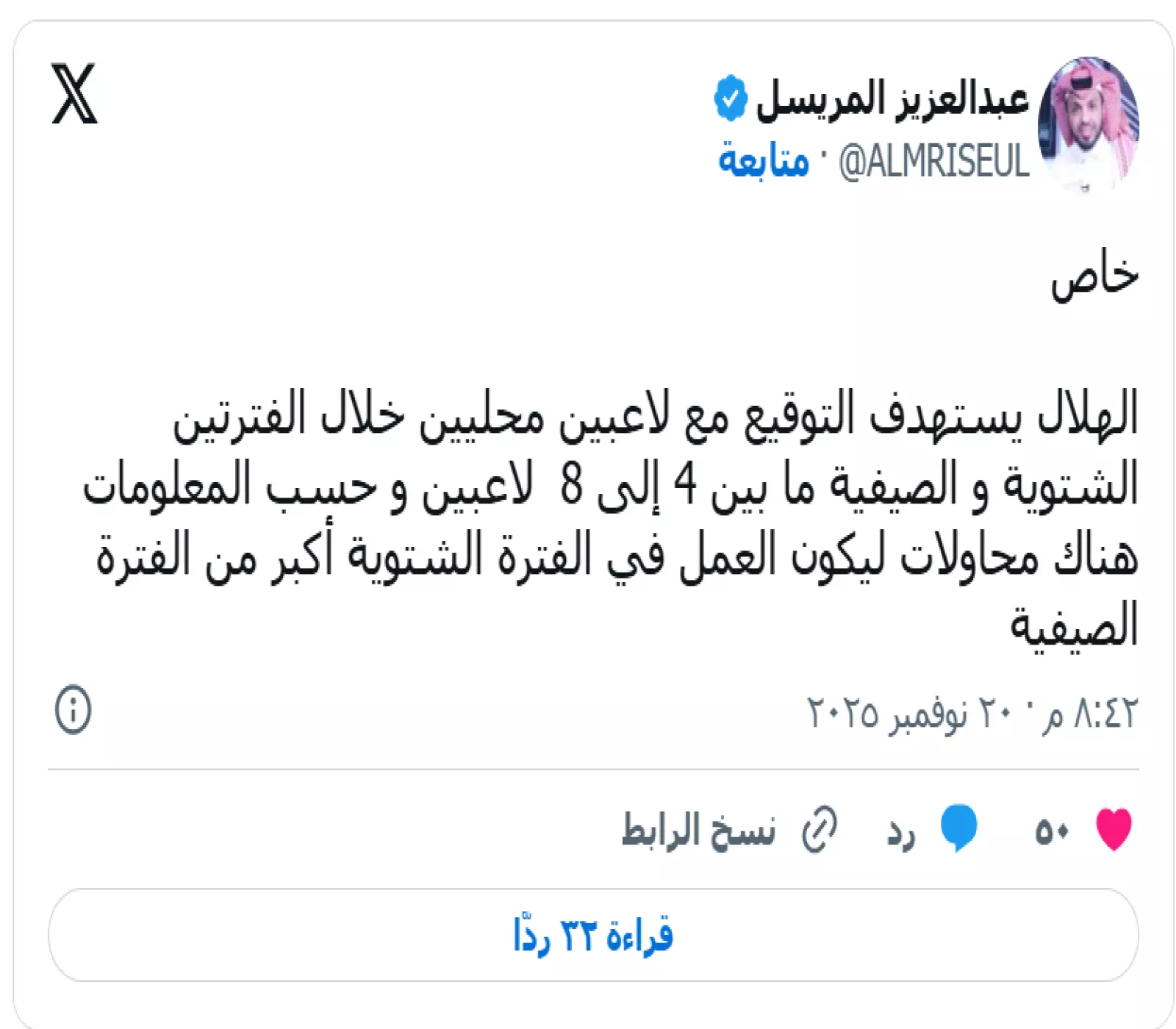 وأوضح المريسل عبر حسابه في منصة "إكس" أن الهلال يسعى إلى توقيع صفقات محلية تتراوح بين 4 و8 لاعبين في كل فترة، مشيرًا إلى أن الفترة الشتوية قد تشهد حركة أكبر من الصيفية، في محاولة لتعزيز صفوف الفريق بمواهب جنونية ترفع من جاهزيته للمنافسات المقبلة.