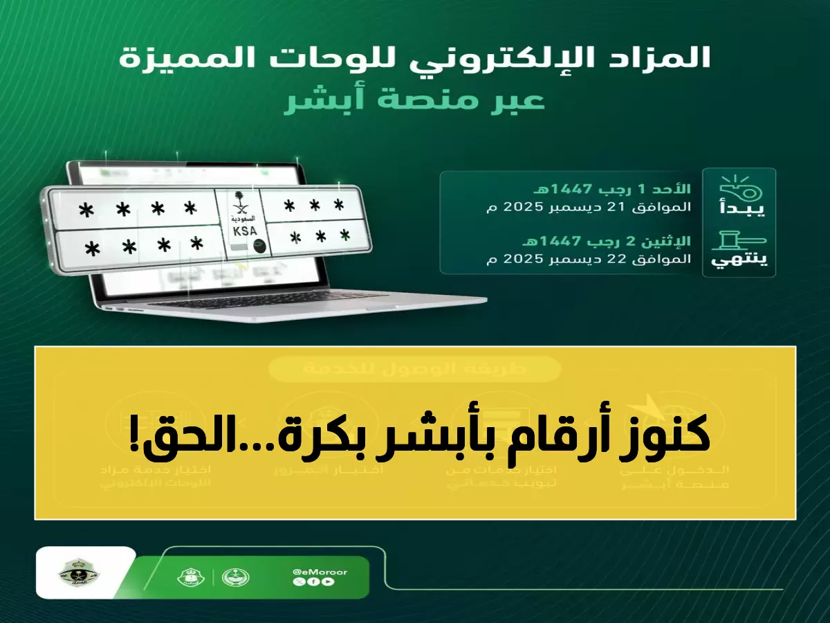 في تطور تقني مذهل يعكس قفزة نوعية في الخدمات الحكومية، تتيح السعودية اليوم لأكثر من 32 مليون مستخدم فرصة المشاركة في مزاد واحد عبر نقرة واحدة فقط! لأول مرة في التاريخ، يمكن للمواطنين شراء اللوحات المميزة من منازلهم عبر منصة أبشر، في خدمة ثورية تنطلق غداً الأحد وقد لا تتكرر الفرصة بهذه السهولة مرة أخرى.