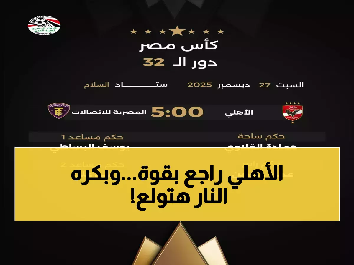 بعد غياب دام موسمين كاملين، يستعد النادي الأهلي لكتابة فصل جديد من تاريخه في كأس مصر، حيث يواجه غداً السبت المصرية للاتصالات في دور الـ32 بملعب السلام الساعة الخامسة مساءً، في عودة طال انتظارها من جماهير القلعة الحمراء.