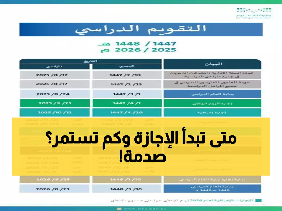 التقويم الأكاديمي الذي أقرته الوزارة للعام الدراسي 1447هـ يحمل في طياته نظاماً متطوراً يضمن 60 يوماً من الإجازات الرسمية موزعة على 180 يوماً دراسياً فعلياً، بما يحقق التوازن المطلوب بين التحصيل الأكاديمي والراحة النفسية للطلاب.
