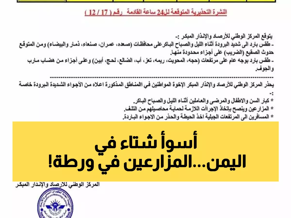 وكشفت النشرة التحذيرية رقم (17/12) الصادرة صباح اليوم، أن صعدة وعمران وصنعاء وذمار والبيضاء ستواجه طقساً شديد البرودة يصل لحد تكوين الضريب القاتل للمحاصيل، بينما تتعرض سبع محافظات إضافية لدرجات حرارة منخفضة بشكل خطير.