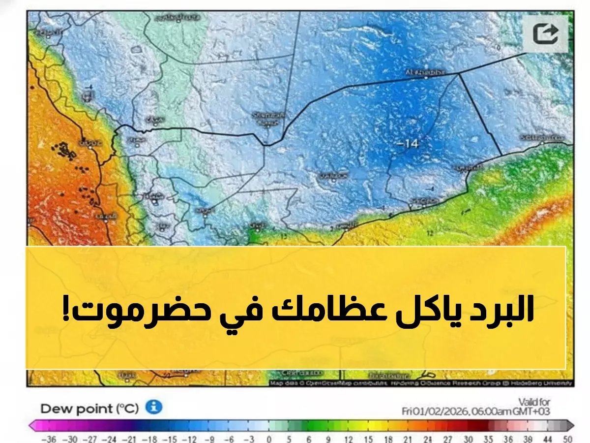 درجتان مئويتان فقط تفصل المناطق الشرقية لليمن عن نقطة التجمد القاتلة، بينما تستعد موجة باردة قاسية لضرب محافظتي حضرموت والمهرة ابتداءً من هذه الليلة.