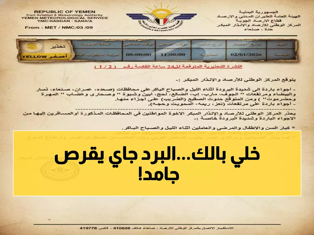وفي إنذار مبكر أصدره المركز يوم الجمعة الثاني من يناير 2026، تم تحديد المناطق المهددة بالبرد القارس والتي تشمل صعدة وعمران والعاصمة صنعاء إلى جانب ذمار والبيضاء، بينما ستشهد مرتفعات الجوف ومأرب وإب والضالع ولحج وأبين وشبوة انخفاضاً حاداً في درجات الحرارة.
