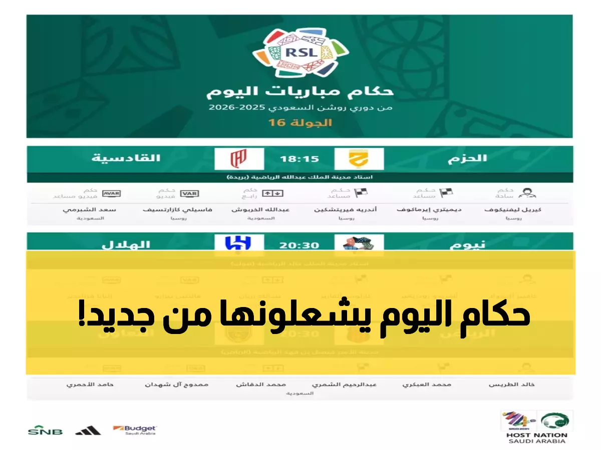 3 مباريات حاسمة في الجولة 16 من دوري روشن تنتظر قرارات حكام قد تغير مصير 6 أندية - هذا ما كشفته القائمة الرسمية التي أعلنها الاتحاد السعودي لكرة القدم لمباريات الأحد الحالي.