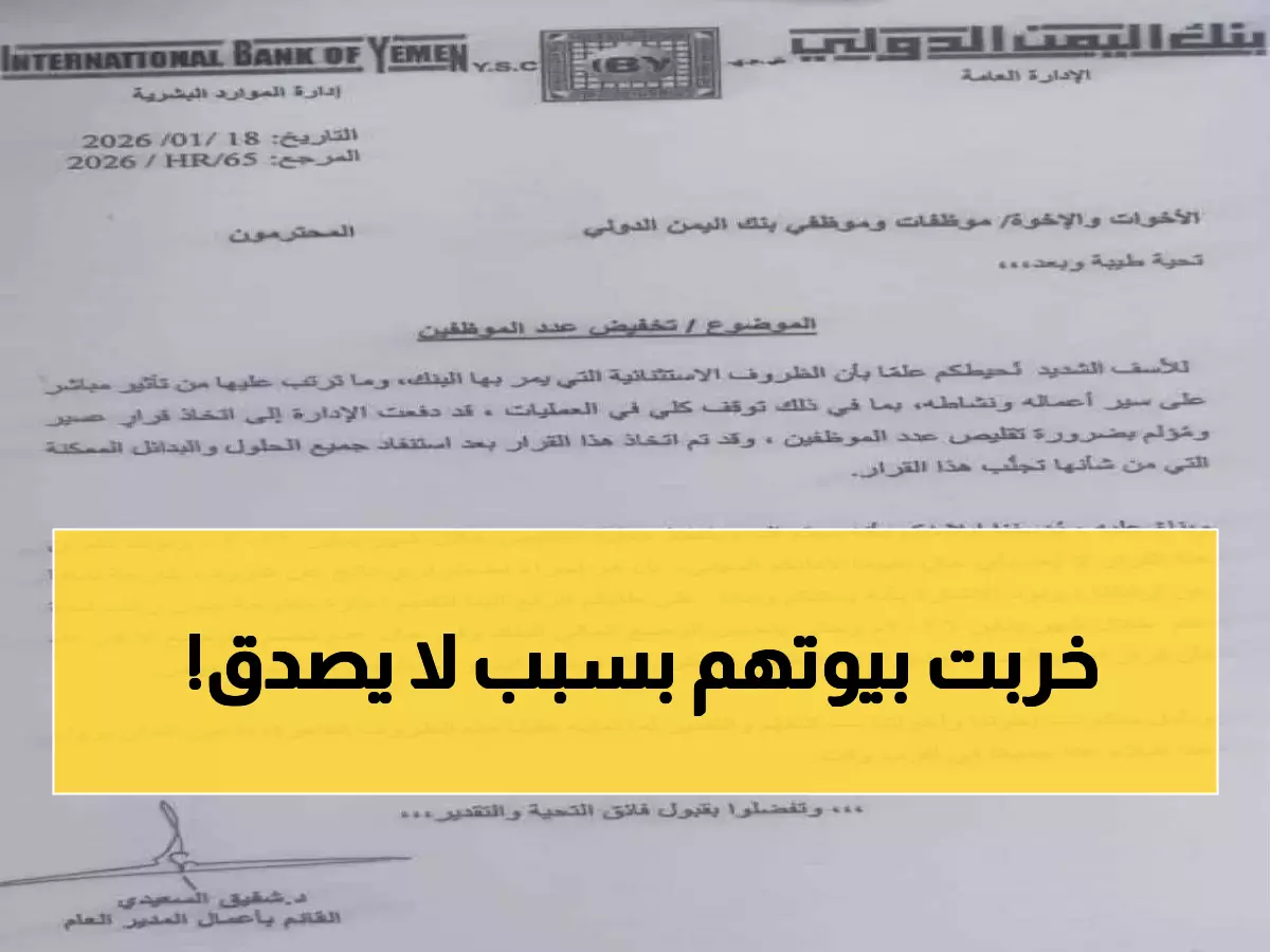 توقف كلي للعمليات المصرفية وتسريح جماعي للموظفين - هذا ما أعلنته إدارة بنك اليمن الدولي في قرار صادم هز أركان القطاع المصرفي اليمني. المئات من الموظفين يواجهون مصيراً مجهولاً بعد قرارات وُصفت بـ "الصعبة والمؤلمة" ستُنفذ خلال الشهر الجاري.