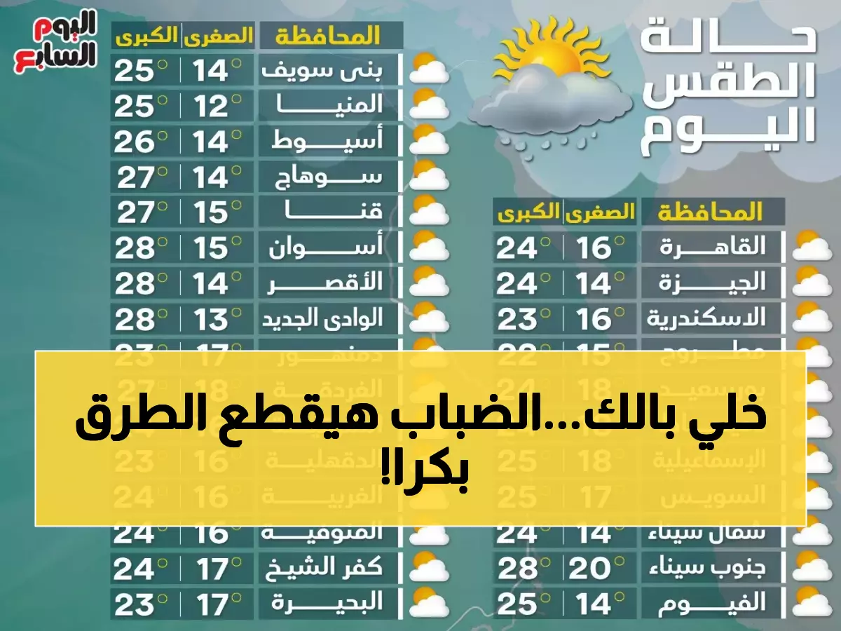 سجلت درجات الحرارة انهياراً حاداً لتصل إلى 11 درجة في شمال الصعيد، بينما أعلنت الهيئة العامة للأرصاد الجوية تحذيراً عاجلاً من شبورة مائية كثيفة ستغلف الطرق الحيوية لمدة 7 ساعات متواصلة، وذلك خلال توقعاتها لطقس الأربعاء 21 يناير 2026.