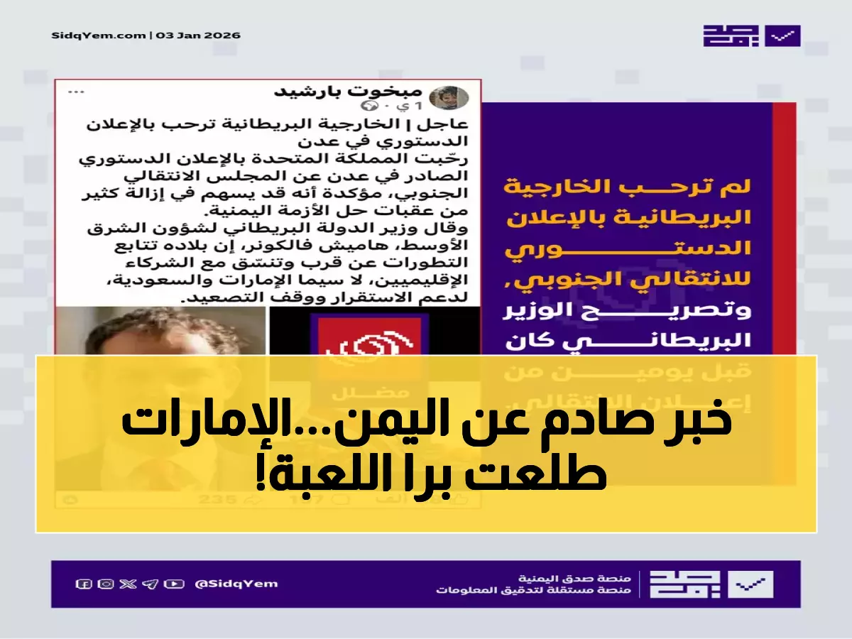 في تطور مفاجئ يعكس انقلاباً جذرياً في التحالفات الإقليمية، أعلنت المملكة المتحدة تمسكها الثابت بـ"يمن موحد ومستقر" وسط انهيار كامل للمجلس الانتقالي الجنوبي وطرد القوات الإماراتية من الأراضي اليمنية خلال 24 ساعة فقط.