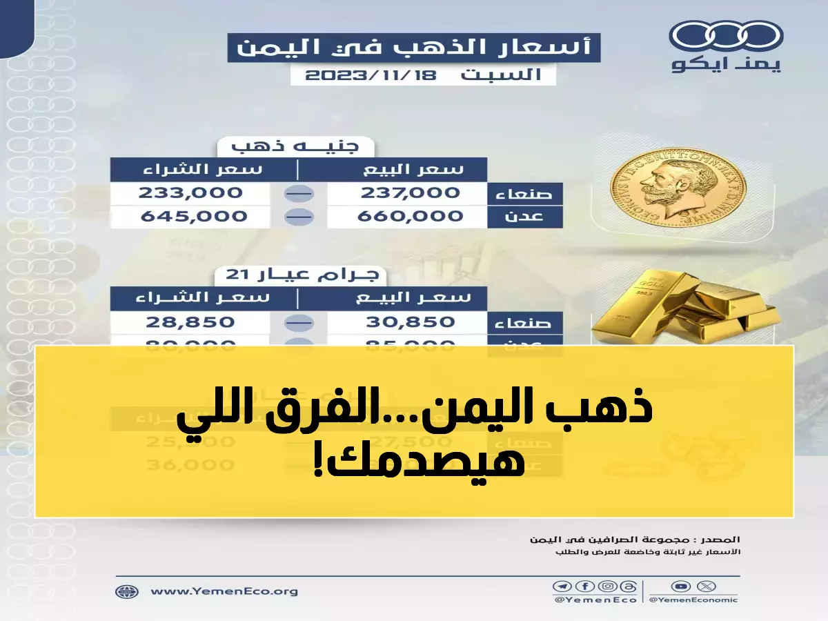 فجوة سعرية صاعقة تزيد عن 200% تضرب أسواق الذهب اليمنية، حيث يباع نفس الجرام في عدن بـ206 آلاف ريال، بينما يُحصل عليه في صنعاء بـ67.8 ألف فقط!