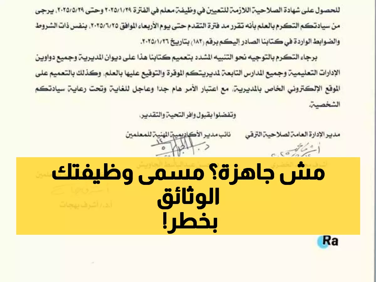 سبعة أيام فقط تفصل آلاف المعلمين عن تغيير مجرى مستقبلهم المهني للأبد. فقد حددت الأكاديمية المهنية للمعلمين المهلة النهائية لاستلام ملفات تغيير المسمى الوظيفي من 21 إلى 28 يناير الجاري، في إجراء حاسم لا يقبل التأجيل أو التساهل.