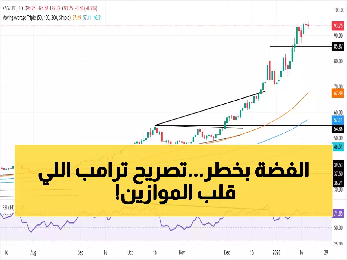 في أقل من 24 ساعة، محت كلمة واحدة من دونالد ترامب أرباح أسبوعين كاملين من تداول الفضة! انهار المعدن الثمين بأكثر من 1% ليصل إلى 93.57 دولار بعد أن خفف الرئيس الأمريكي من نبرته العدائية حول غرينلاند في خطابه بمنتدى دافوس، معلناً استعداده للتفاوض مع الدنمارك.