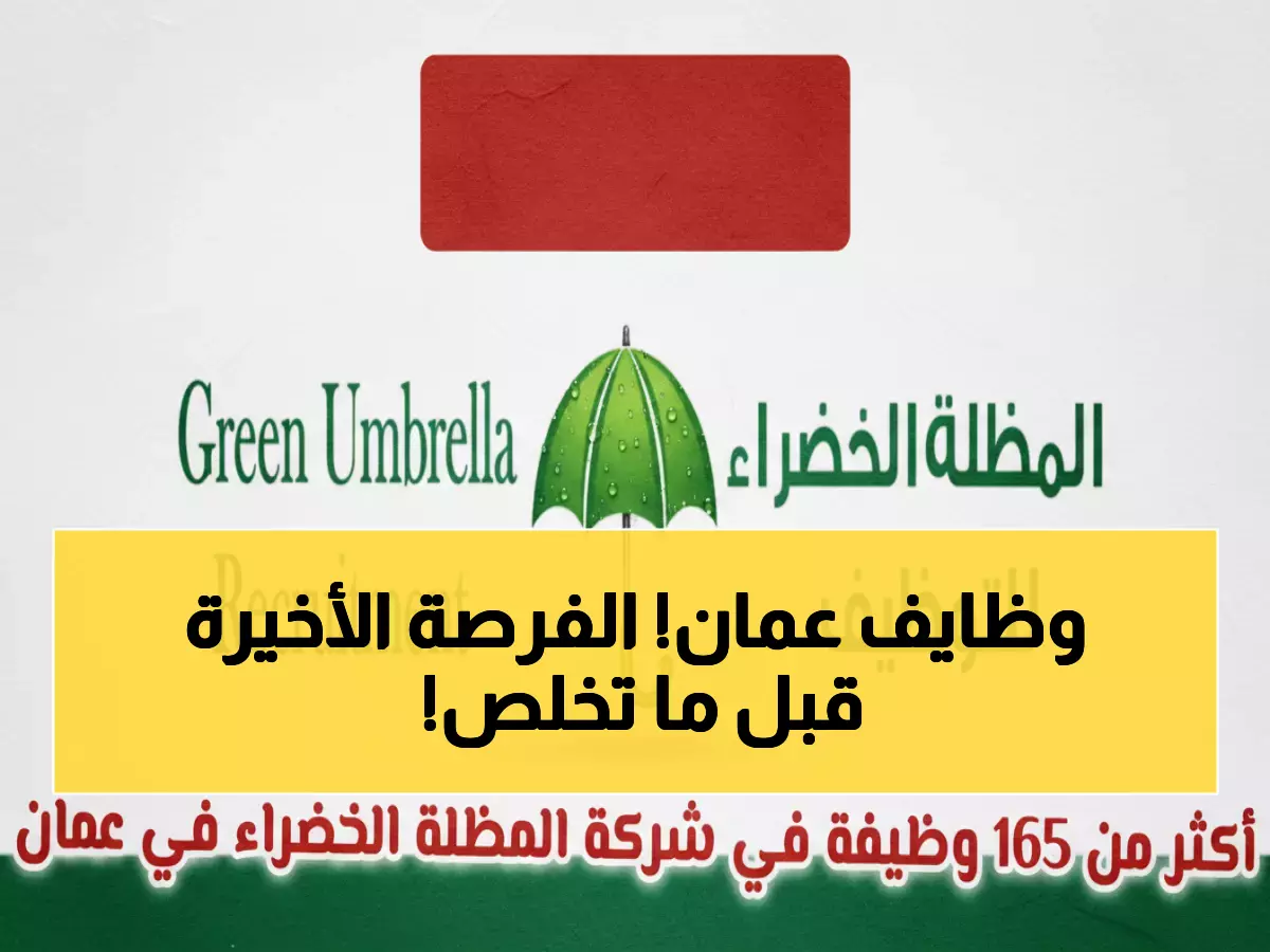 أعلنت شركة المظلة الخضراء في سلطنة عمان عن فتح باب التوظيف لأكثر من 165 وظيفة شاغرة، في خطوة هي الأكبر من نوعها مؤخراً، تغطي ثمانية قطاعات مهنية حيوية.