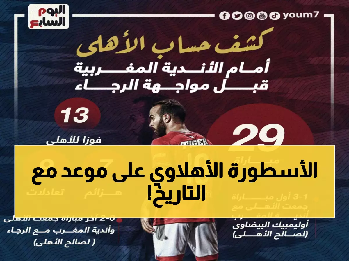 15 انتصاراً مقابل 7 هزائم فقط - هكذا ينطق التاريخ بلسان الأرقام عن هيمنة النادي الأهلي المطلقة على الأندية المغربية عبر 34 مواجهة ناريّة، بينما يقف المارد الأحمر الليلة على بُعد 90 دقيقة فحسب من كتابة رقم جديد قد يصل به للانتصار رقم 16 أمام الجيش الملكي المغربي.