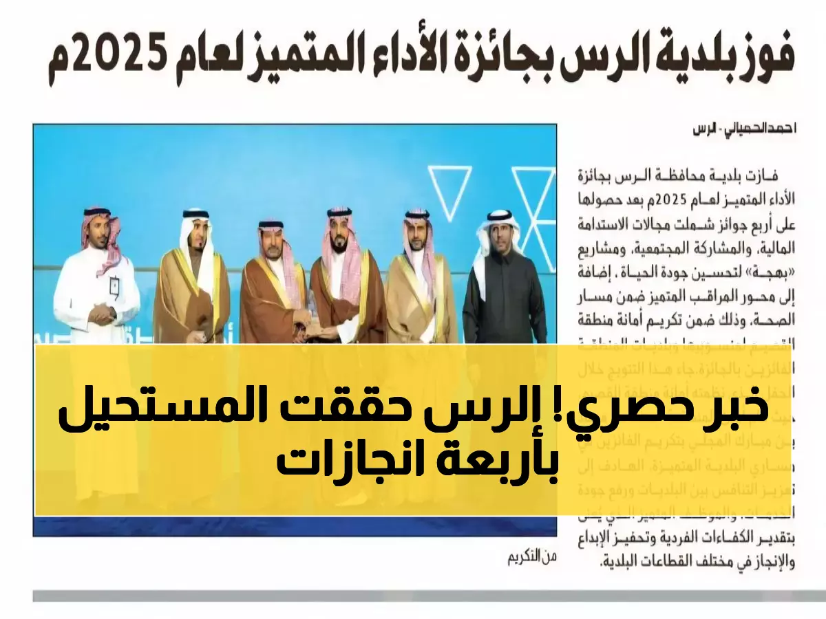 أربع جوائز في عام واحد - إنجاز استثنائي حققته بلدية محافظة الرس ليضعها في المقدمة ضمن جائزة الأداء المتميز لعام 2025م، محطمة بذلك الأرقام القياسية للتميز البلدي على مستوى المنطقة.