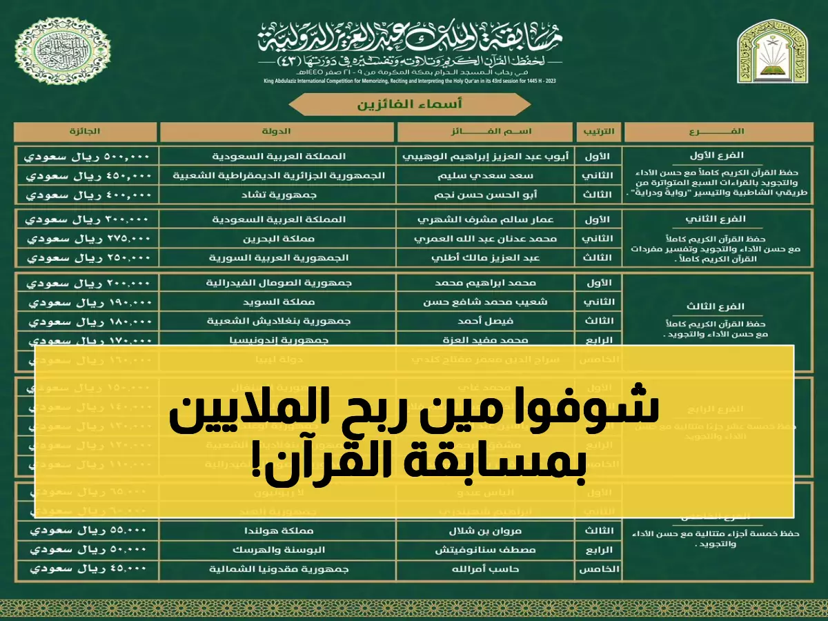 حصد عبدالله بن أحمد المطوع جائزة قدرها 400 ألف ريال بتصدره المركز الأول في مسابقة خادم الحرمين الشريفين للقرآن الكريم، ضمن توزيع إجمالي تجاوز 7 ملايين ريال على الفائزين في الدورة السابعة والعشرين.
