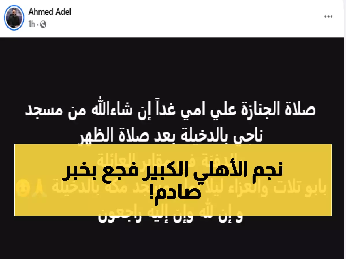 في يوم حزين للأسرة الكروية، أعلن أحمد عادل، النجم السابق للنادي الأهلي، عن وفاة والدته يوم السبت، ونشر عبر صفحته الشخصية على فيسبوك تفاصيل التشييع: "صلاة الجنازة على أمي غداً إن شاء الله من مسجد ناجي بالدخيلة بعد صلاة الظهر والدفنة في مقابر العائلة بأبو تلات والعزاء ليلاً أمام مسجد مكة بالدخيلة وإنا لله وإنا إليه راجعون". يأتي هذا الحدث الأليم فيما يواجه الفريق الأول للنادي تحديًا فنيًا آخر مع إيقاف لاعب وسطه، مروان عطية.