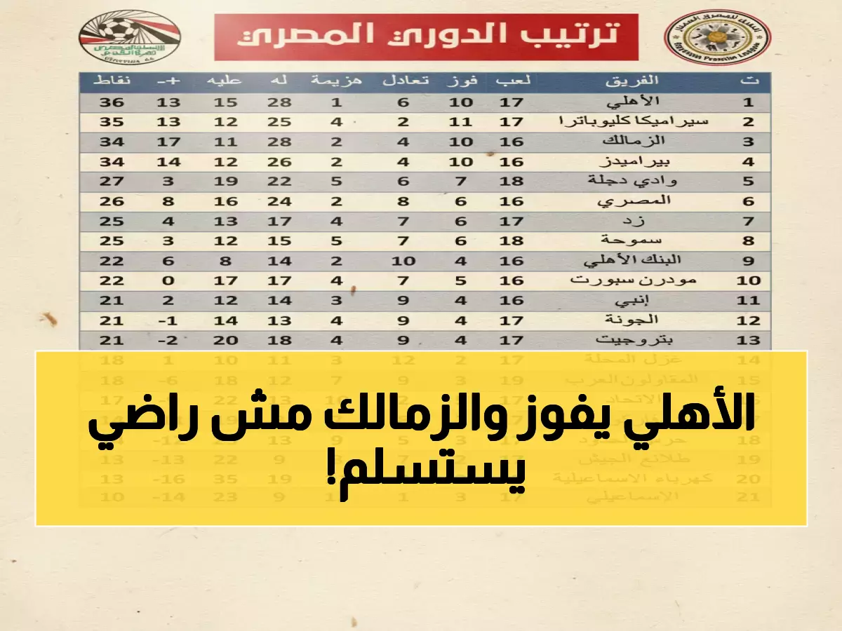 الرئيسية / شؤون محلية / عاجل: صراع نار على قمة الدوري المصري... الأهلي يتصدر بنقطة واحدة والزمالك يهدد!