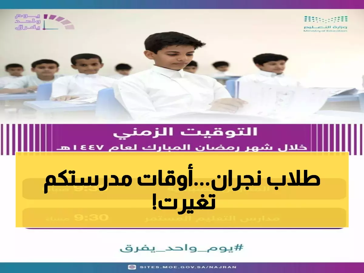 من العاشرة صباحاً وحتى الثالثة عصراً – هذا هو التوقيت الرسمي الجديد الذي حددته إدارة تعليم نجران للدوام المدرسي طوال شهر رمضان المبارك، في خطوة تهدف لمواءمة العملية التعليمية مع متطلبات الصيام والعبادة.