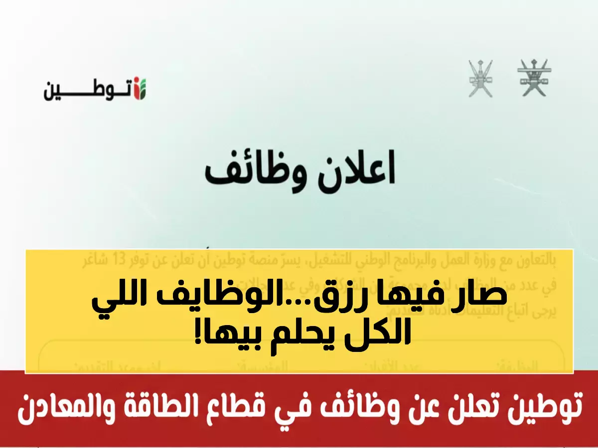 في خطوة استثنائية تعكس طموحات رؤية 2040، كشفت وزارة العمل العمانية عن 10 وظائف متخصصة في قطاع الطاقة والمعادن، تشمل فرصاً نادرة للعمل مع عمالقة الصناعة العالمية مثل بيكر هيوز ومرسى للغاز الطبيعي المسال.