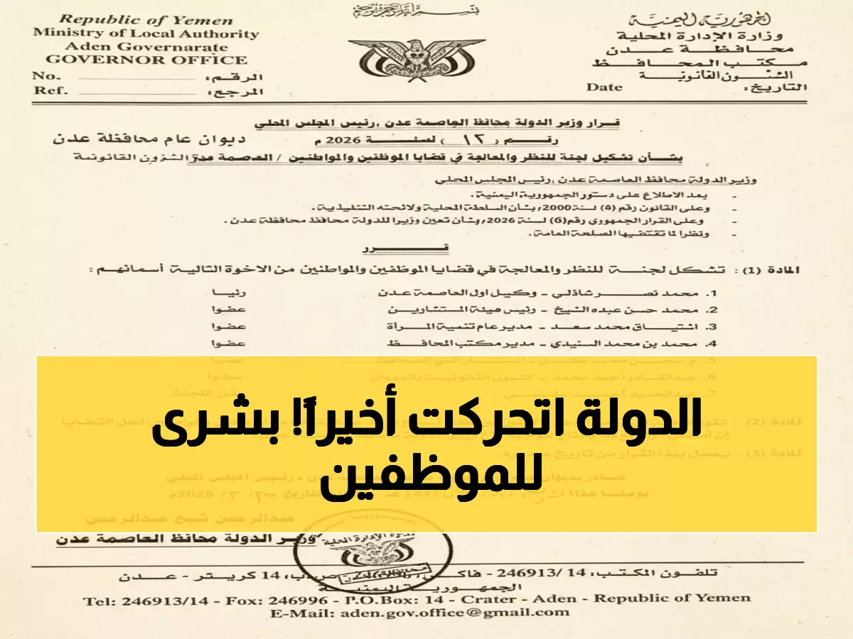 عاجل عدن: قرار تاريخي يُنهي معاناة الموظفين والمواطنين... لجنة خاصة تحل الملفات العالقة خلال أيام!