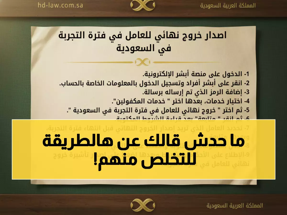 الطريقة الحصرية تتم عبر منصة أبشر أعمال، حيث تمكن أصحاب العمل من إصدار تأشيرة الخروج النهائي للعمالة التجارية خلال فترة التجربة بشكل فوري ومجاني تماماً. الأخطر في هذه الخدمة أنها غير قابلة للإلغاء نهائياً بمجرد تنفيذها.