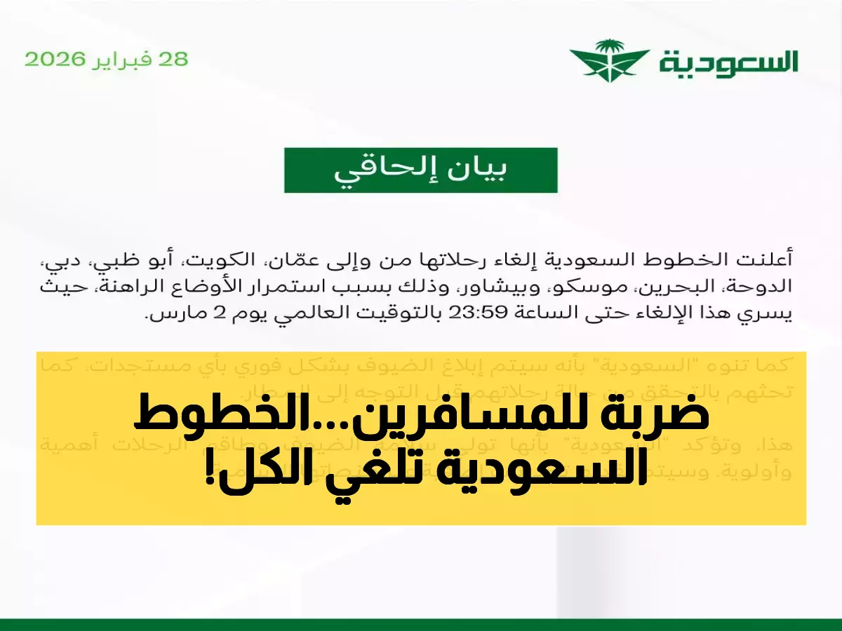 أكثر من 50 ألف مسافر يومياً في حالة ترقب وقلق بعد قرار مجموعة الخطوط السعودية المفاجئ بتمديد فترة إلغاء رحلاتها إلى 8 وجهات حيوية حتى الساعة 23:59 بالتوقيت العالمي من يوم 4 مارس المقبل.