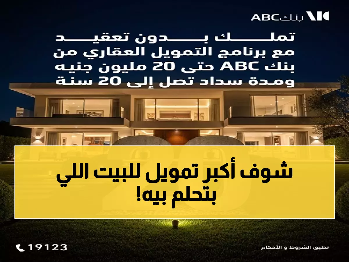 أعلن بنك ABC مصر رسمياً عن إطلاق برنامج تمويل عقاري استثنائي، يصل حدّه الأقصى إلى 20 مليون جنيه مصري، مع فترة سداد مرنة تمتد حتى 20 عاماً، في خطوة وصفت بأنها "أضخم" من نوعها ضمن استراتيجيته لتعزيز حلول التمويل العقاري.