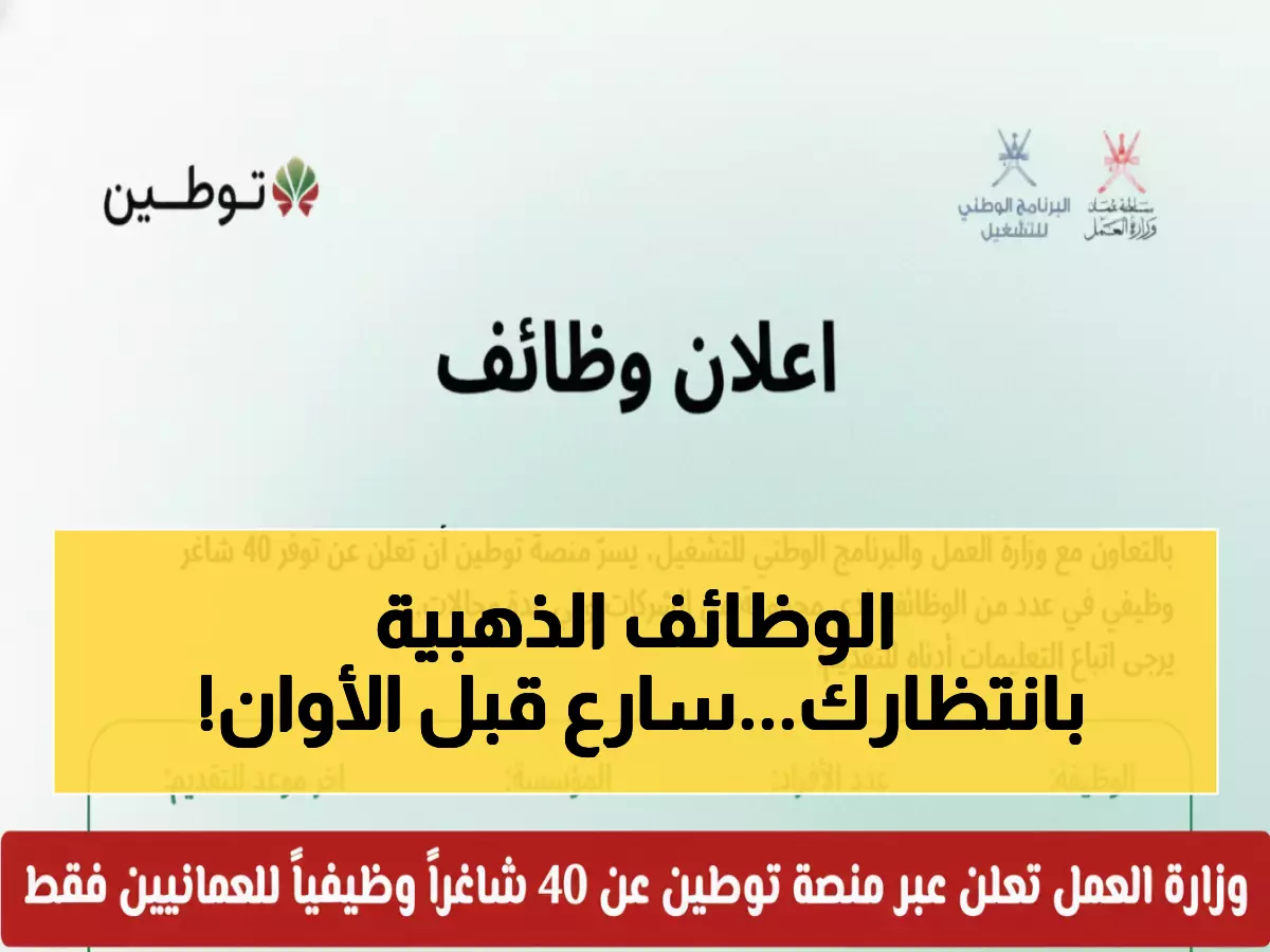40 فرصة ذهبية تختفي خلال 48 ساعة! هذا ما أعلنته منصة توطين بالشراكة مع وزارة العمل العمانية، في مبادرة استثنائية تستهدف تمكين الكوادر الوطنية قبل انتهاء المواعيد النهائية للتقديم.