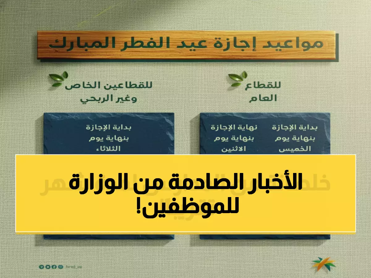 هل تعلم ماذا قررت 'وزارة الموارد البشرية' للقطاع الخاص؟ القرار الرسمي صدر الآن ويخص ملايين الموظفين: 4 أيام عمل كاملة مدفوعة الأجر بلا خصم، هي إجازة عيد الفطر لهذا العام.