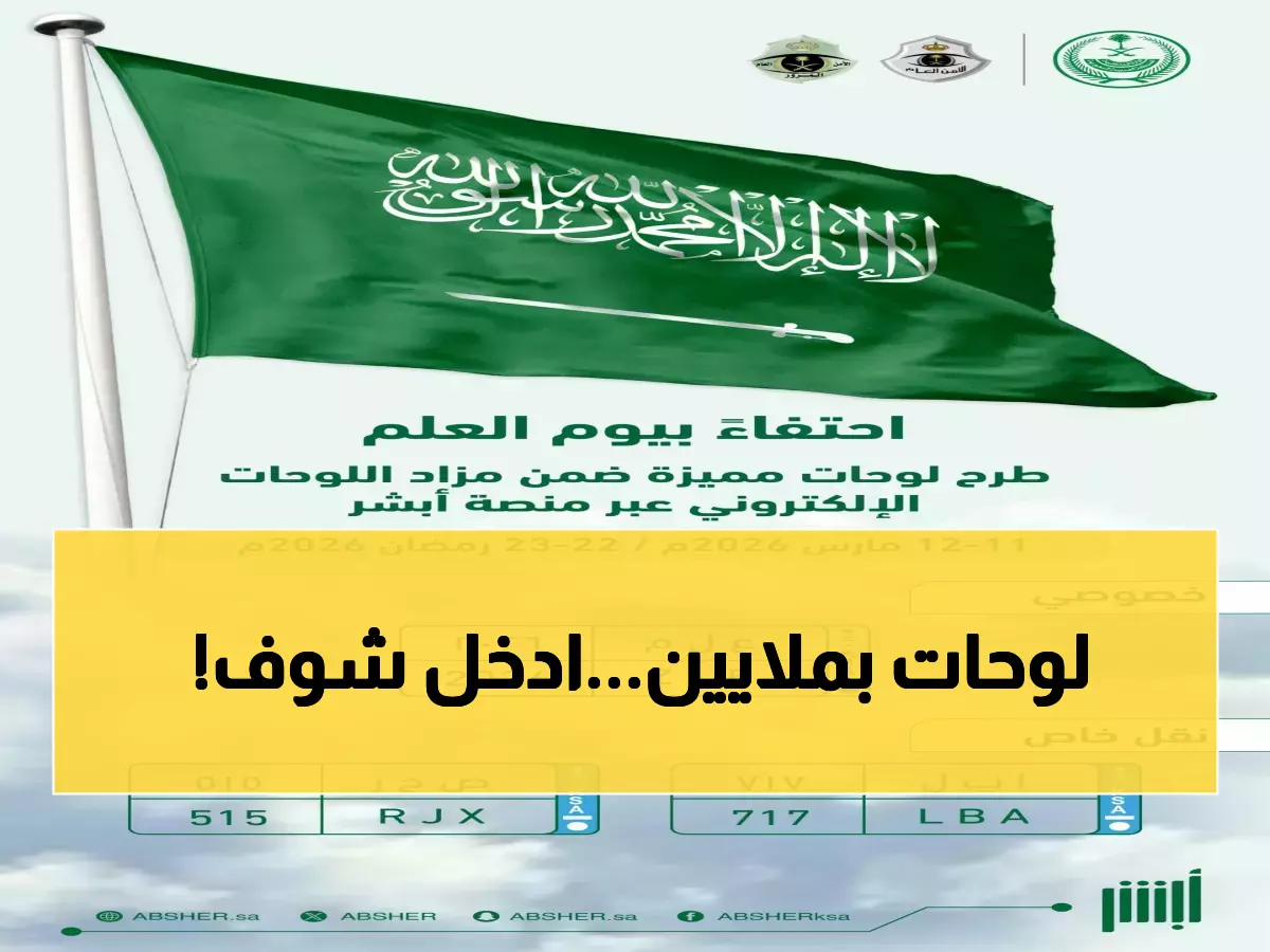 أطلقت منصة أبشر ثلاث لوحات سيارات نادرة فقط ضمن مزاد إلكتروني ينتهي في مساء الخميس، 12 مارس 2026، وذلك بمناسبة يوم العلم السعودي، في منافسة حاسمة تستمر أقل من يومين.
