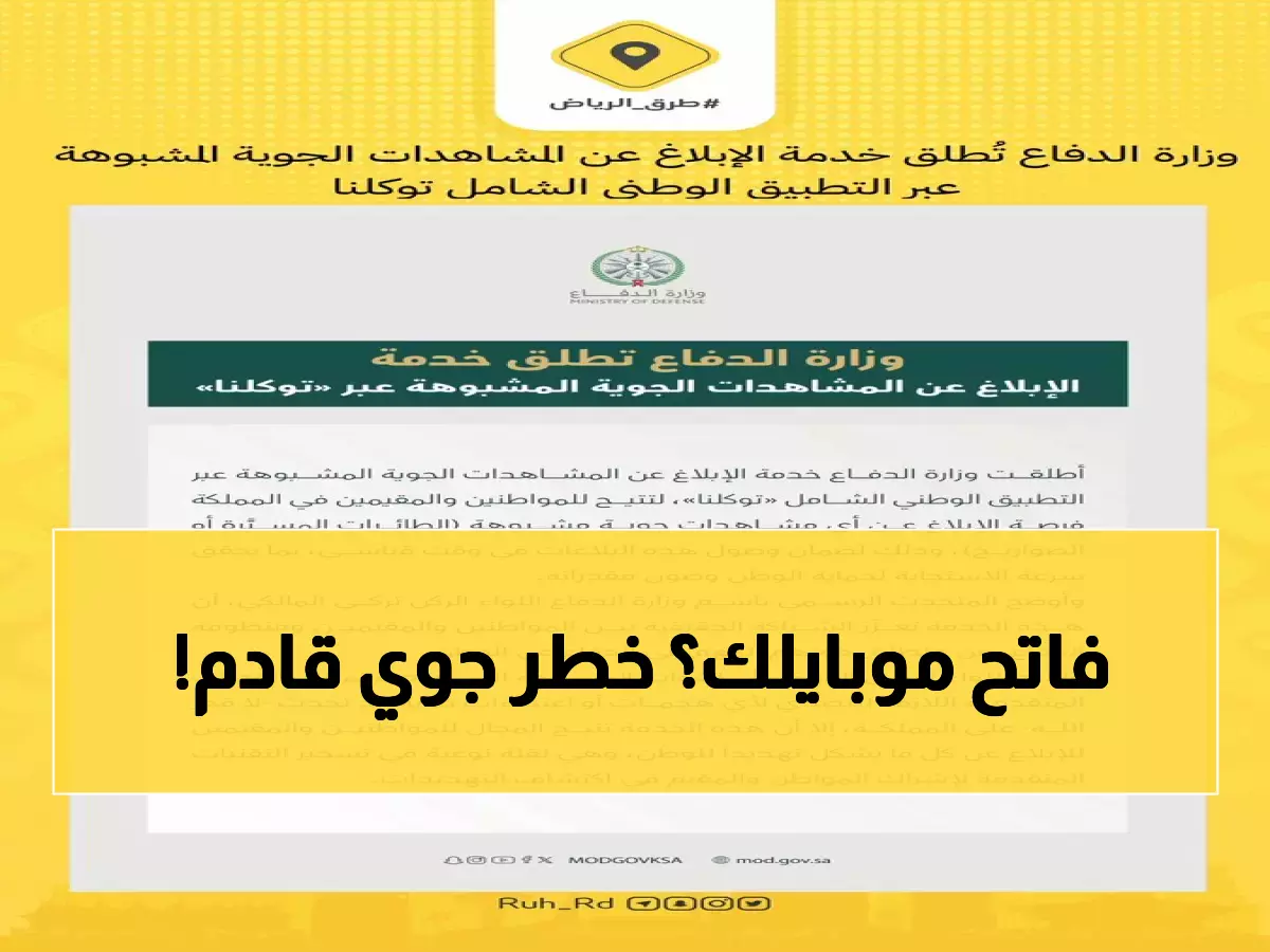 35 مليون عين تراقب السماء السعودية الآن - في خطوة تاريخية غير مسبوقة، حوّلت المملكة كل مواطن ومقيم إلى جزء فعّال من منظومة الدفاع الوطني عبر إطلاق خدمة الإبلاغ عن المشاهدات الجوية المشبوهة في تطبيق "توكلنا".