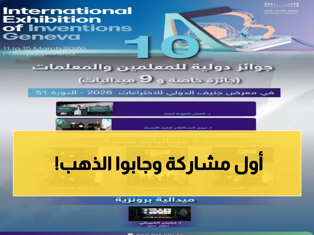 نسبة نجاح مذهلة بلغت 100%... هكذا دخل المعلمون السعوديون التاريخ من أوسع أبوابه! في إنجاز لم تشهده دورات معرض جنيف الدولي للاختراعات الـ51 السابقة، حقق كافة المشاركين من معلمي ومعلمات المملكة جوائز دولية في أول ظهور لهم على هذه المنصة العالمية المرموقة.