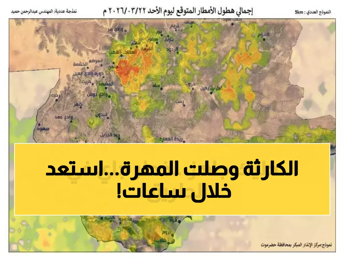 وحدة إدارة الأزمات والكوارث تحذر من أمطار "شديدة الغزارة" وسيول مدمرة ستجتاح محافظة المهرة خلال الساعات الـ72 القادمة، في تطور خطير يهدد آلاف السكان عبر نطاق جغرافي واسع يمتد من الصحراء إلى الشريط الساحلي الكامل.