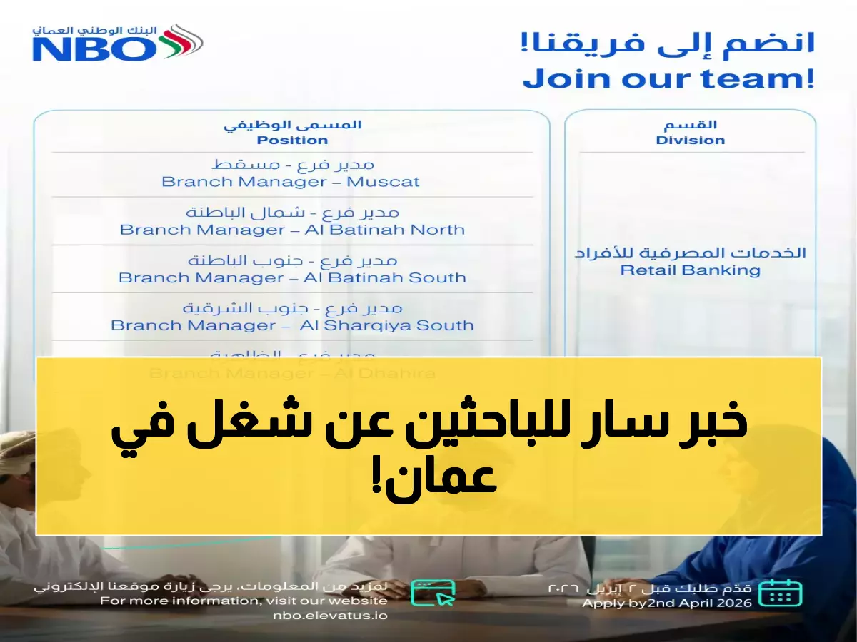 الرئيسية / تقارير وحوارات / عاجل: البنك الوطني العماني يعلن فتح 20+ وظيفة ذهبية للعمانيين - آخر موعد للتقديم 2 أبريل!