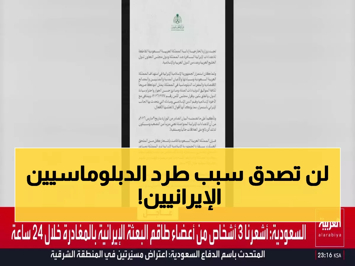 مهلة 24 ساعة فقط - هذا كل ما منحته المملكة العربية السعودية لثلاثة من أعضاء البعثة الدبلوماسية الإيرانية، بينهم الملحق العسكري ومساعده، للمغادرة بعد إعلانهم "أشخاصاً غير مرغوب فيهم" في قرار دبلوماسي حاسم يكشف عن تصاعد خطير في التوتر الإقليمي.