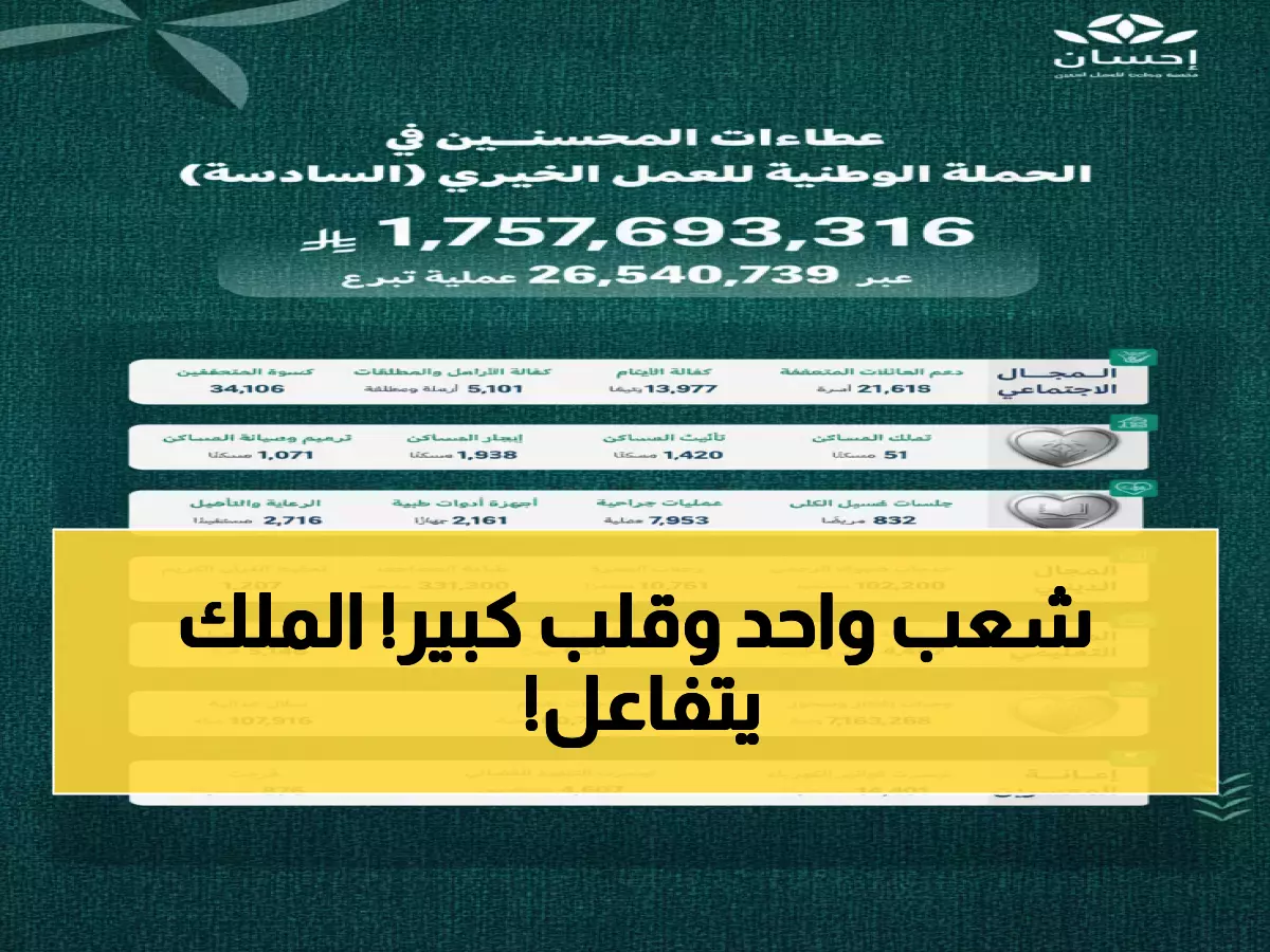 وشهدت منصة "إحسان" الوطنية تدفقاً هائلاً من التبرعات وصل إلى 26.5 مليون عملية تبرع - رقم يفوق عدد سكان المملكة ويعني أن كل مواطن ومقيم شارك في هذه الملحمة الإنسانية أكثر من مرة.