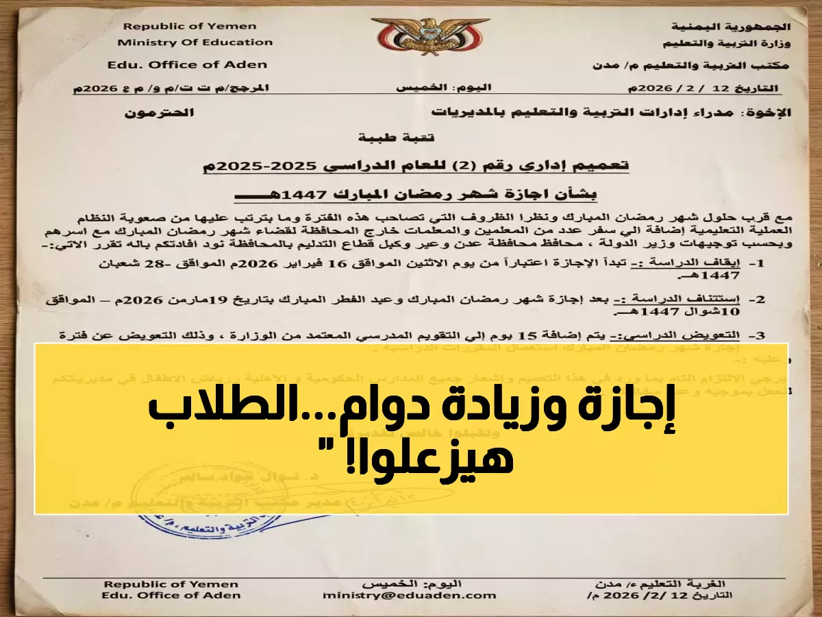 عاجل في عدن: مكتب التربية يقر إجازة رمضان ويضيف 15 يوماً للتقويم الدراسي... قرار يغير مواعيد الدراسة للطلاب والمعلمين!