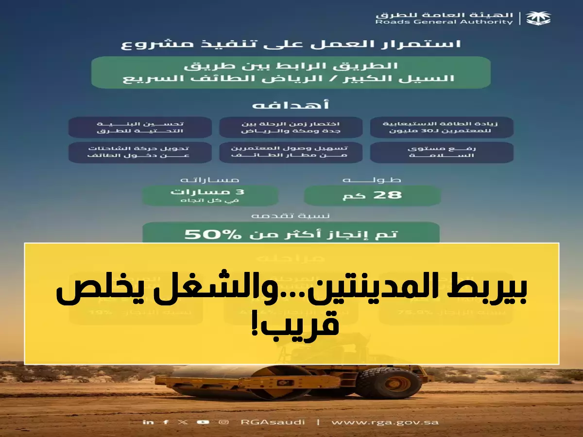 اكتمل تنفيذ الجزء الأكبر من مشروع ضخم لربط وتوسعة طريق يبلغ طوله 25 كيلومتراً بين الطائف وطريق الرياض السريع، حيث أعلنت الهيئة العامة للطرق وصول المشروع إلى مراحله النهائية، مع بقاء أعمال محدودة تتعلق بتنفيذ تقاطع حيوي وحيد.