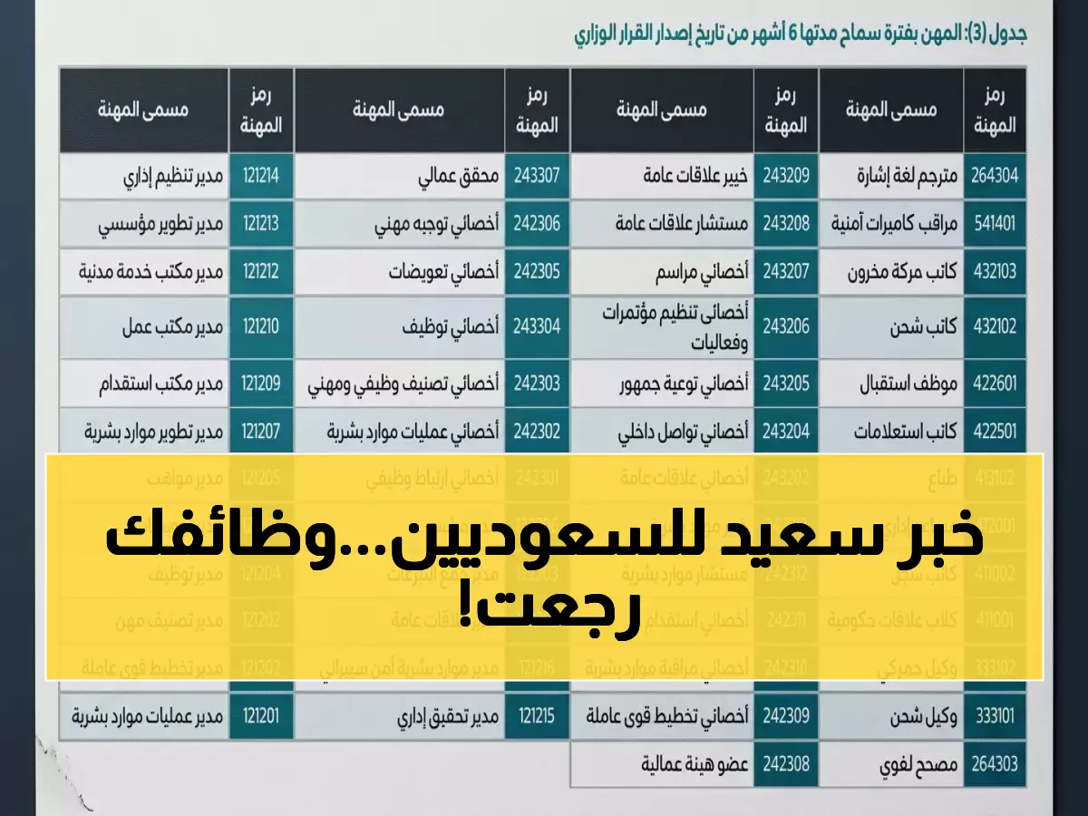 وضمت قائمة المهن المستهدفة التي سيبدأ تطبيق القرار عليها فوراً مسميات مثل: مترجم، حارس شخصي، أمين مخزن، موظف استقبال فندق، سكرتير تنفيذي، وأمين صندوق.