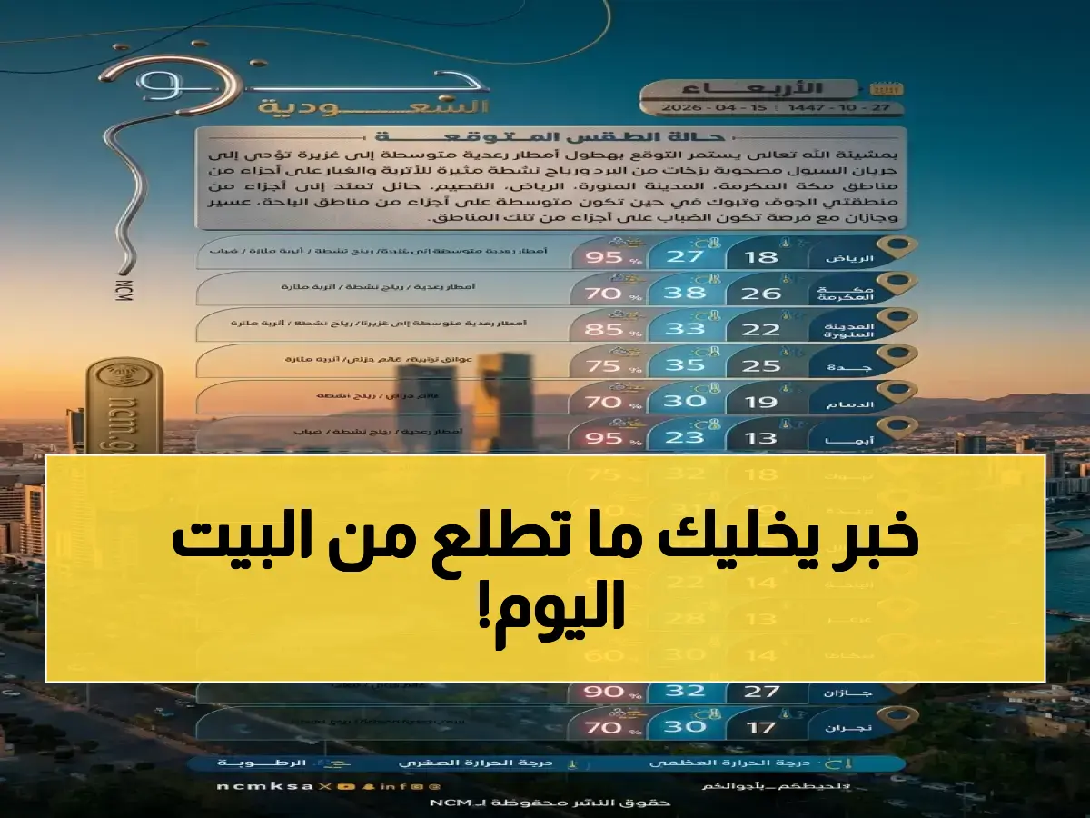 الرئيسية / شؤون محلية / عاجل: الأرصاد تطلق تحذيراً من أمطار رعدية صادمة ورياح خطيرة تصل لـ42 كم/س تؤثر على 12 منطقة… إعجاب الأهالي