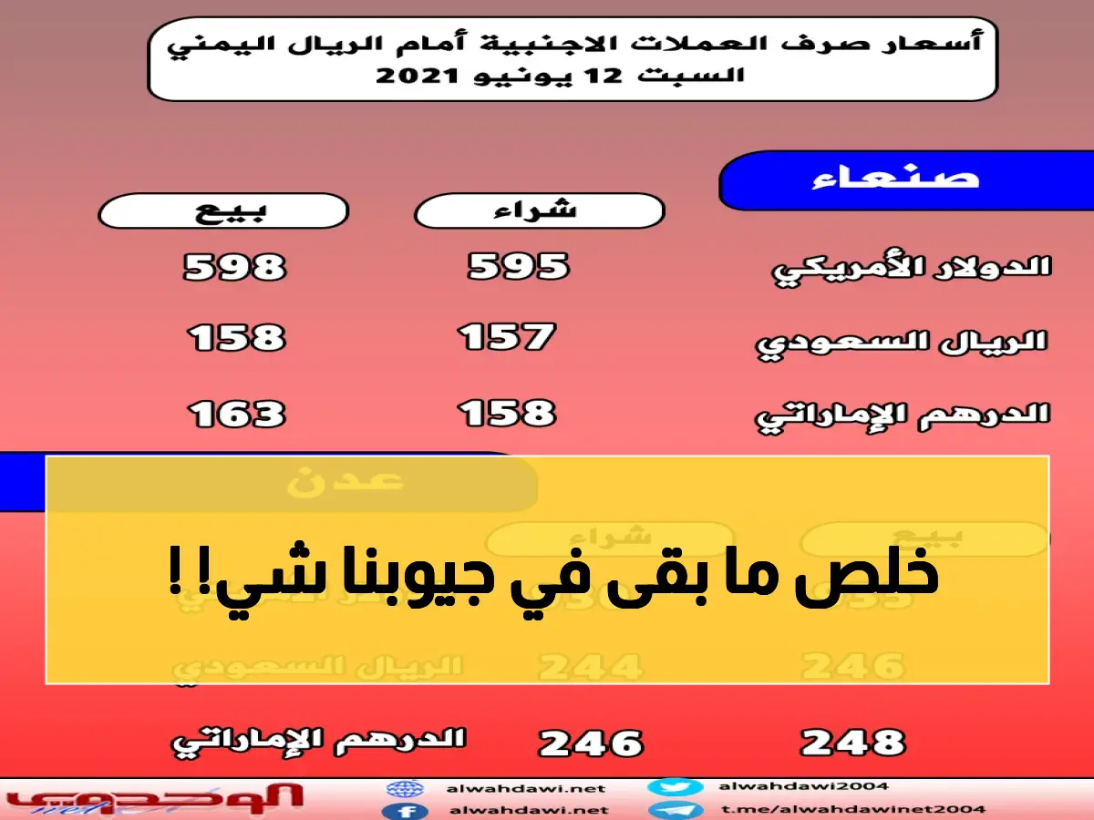 1582 ريال يمني! هذا هو سعر البيع الذي يجب دفعه الآن في العاصمة المؤقتة عدن مقابل دولار واحد فقط، وفقاً لما أعلنته مصادر مصرفية صباح اليوم السبت. وبلغ فارق السوق بين شراء وبيع الدولار 24 ريالاً، مما يشكل عبئاً إضافياً فورياً على كل عملية تحويل أو تجارة.