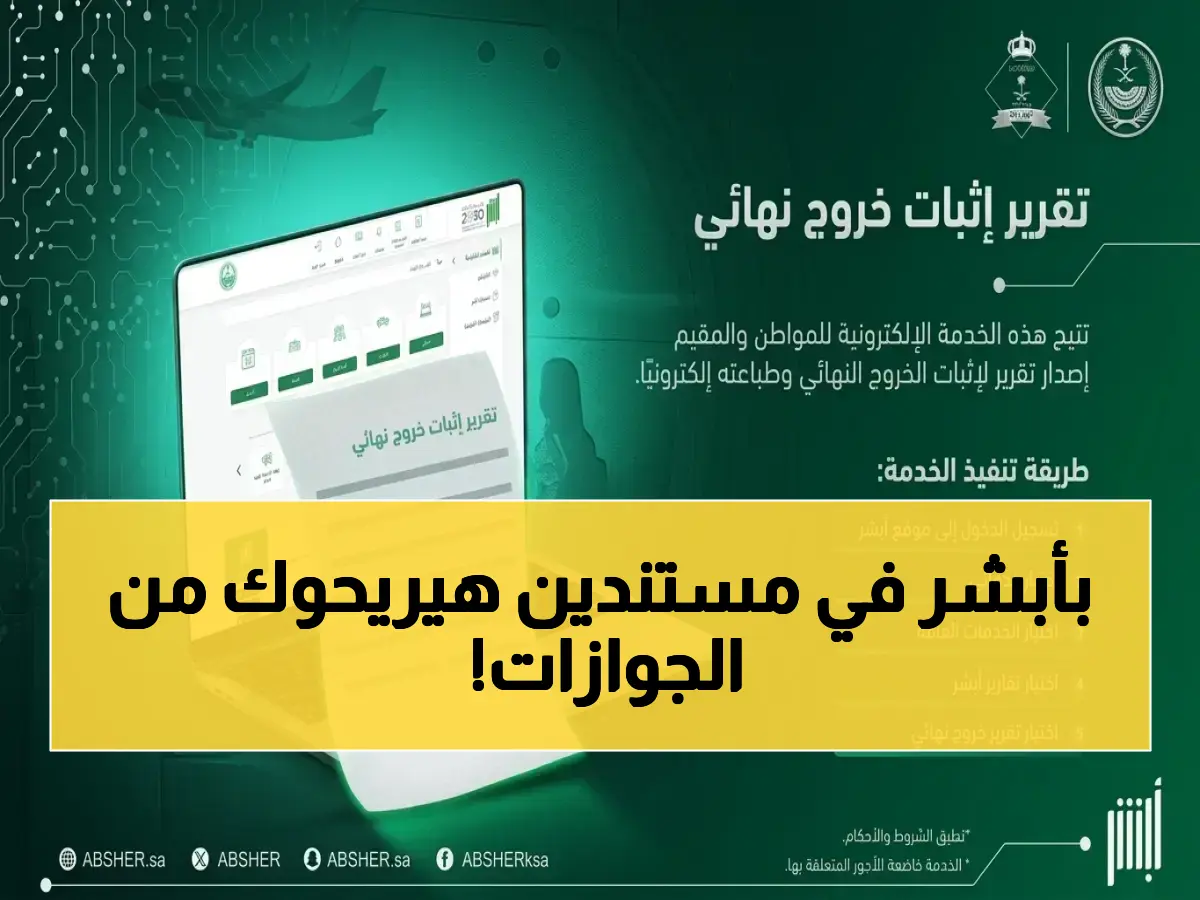 - لتقرير إثبات الخروج النهائي: 1. الولوج إلى منصة أبشر أعمال. 2. الانتقال إلى 'خدمات أعمالي'. 3. النقر على خيار 'تقرير إثبات خروج نهائي'. 4. إنشاء وطباعة المستند.