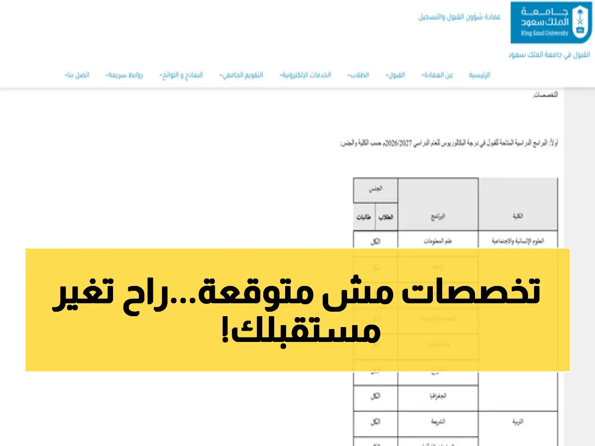 أعلنت جامعة الملك سعود رسمياً عن تحديثات في مسارات القبول والتخصصات المتاحة لبرامج البكالوريوس للعام الدراسي المقبل 2026/2027، تضم مجموعة من التخصصات في المسارات الإنسانية والعلمية، مما يعني وجود خيارات جديدة قد تغيّر مسارك الأكاديمي.