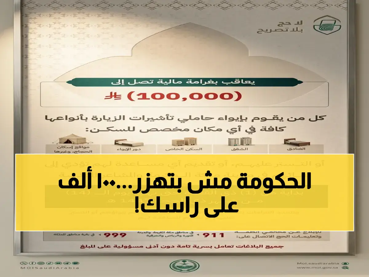 100 ألف ريال غرامة ستدفعها، وقد تتضاعف، إذا استقبلت في سكنك بمكة أو المشاعر المقدسة شخصاً يحمل تأشيرة زيارة خلال موسم الحج.