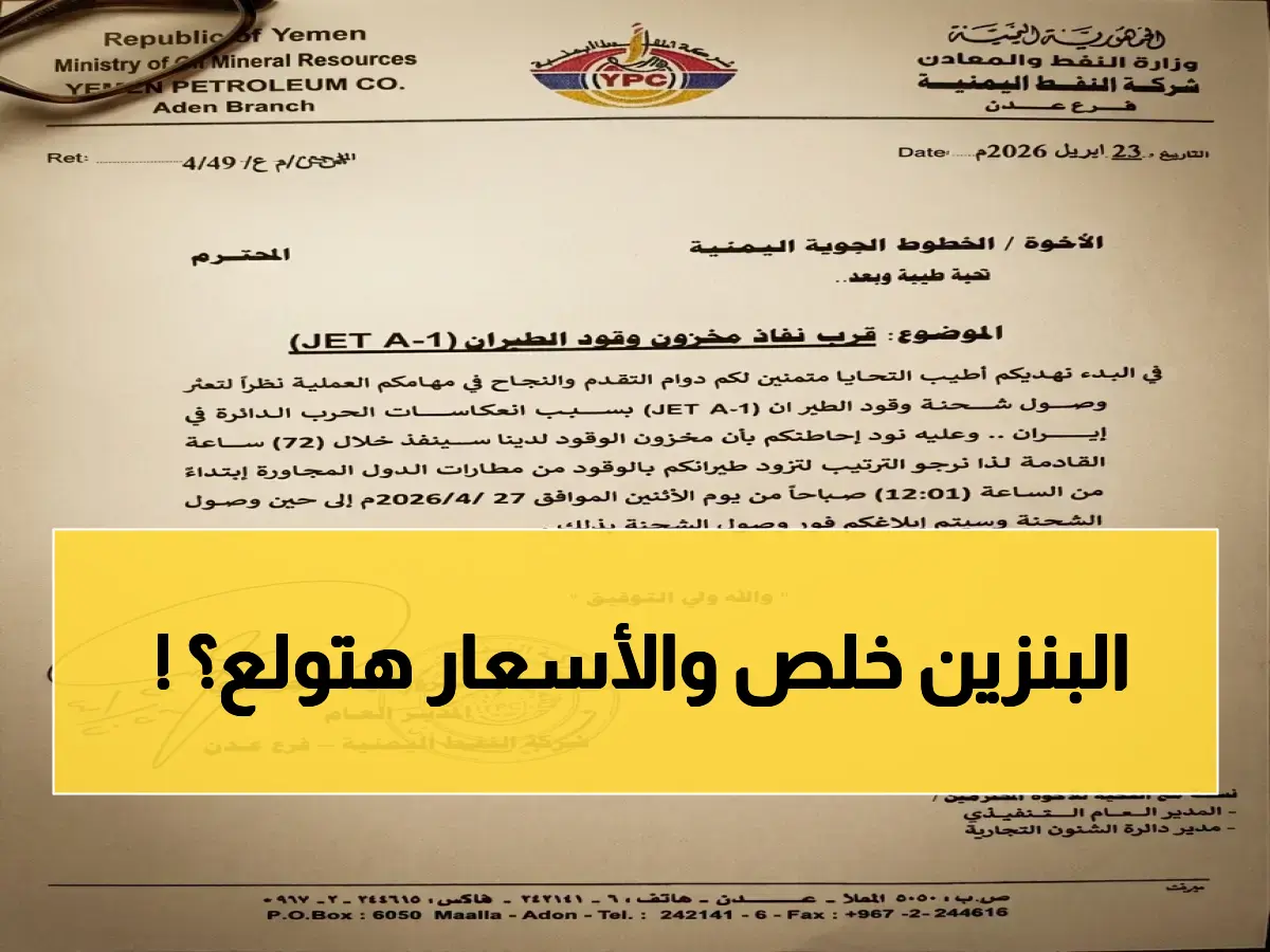 تتجه حركة الطيران اليمنية إلى شلل محتمل بعد أن حذرت شركة النفط اليمنية – فرع عدن – رسمياً من نفاد مخزون وقود الطائرات خلال 72 ساعة فقط. جاء الإنذار في مذكرة وجهتها الشركة إلى إدارة شركة الخطوط الجوية اليمنية، حيث أرجعت تعثر الإمدادات إلى تداعيات الحصار المفروض على مضيق هرمز.