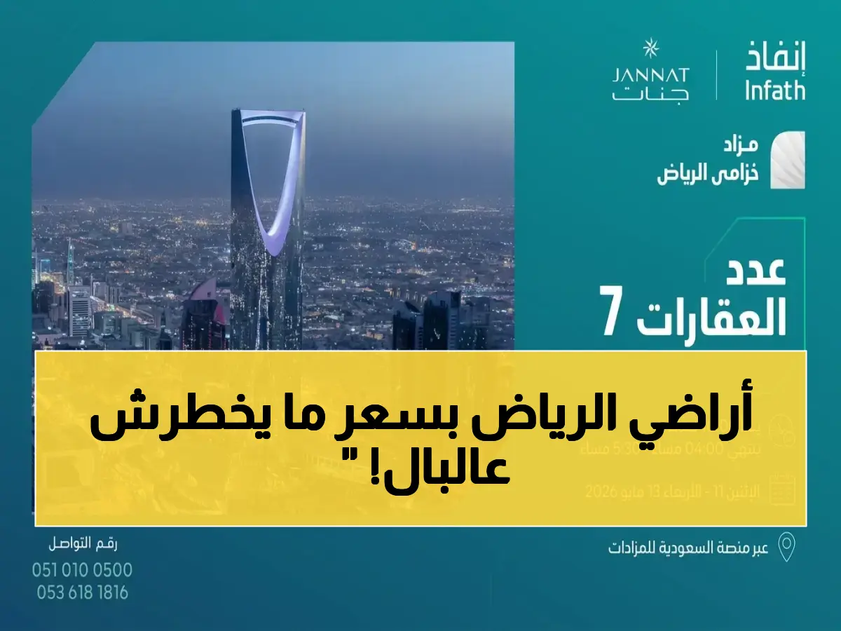 الرئيسية / مال وأعمال / مفاجأة في الرياض: أرقام تخطر ببالك! مزاد عقاري يطرح أراضي واستراحات مسورة في أماكن استراتيجية بمزايا عديدة خلال الفترة من 11 إلى 13 مايو 2026
